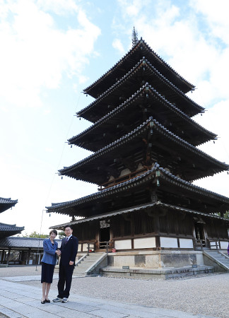 高市早苗首相と韓国の李在明大統領は14日午前、奈良県斑鳩町にある法隆寺を共に視察した=代表撮影 【時事通信社】